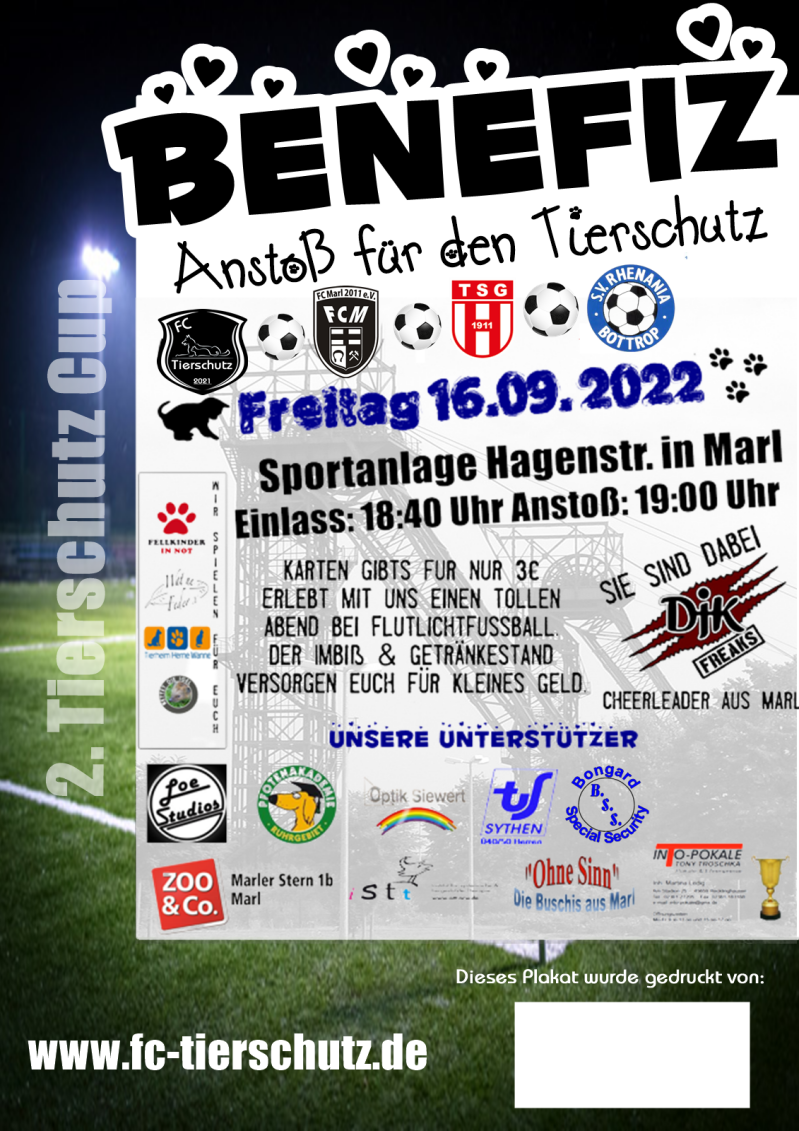 Am Freitag den 16 September 2022 war es endlich soweit. Der zweite Tierschutz Cup fiand bei herbstlichen Regenwetter statt, und das im wunderschönen Marl. Die Stadt Marl hat neben ihren ganzen Sehenswürdigkeiten wie den Zechen der Auguste Victoria - den Marler Stern - die ländlichen Gegenden um Polsum - oder das alter Wasserwerk in Sickingmühle noch mehr zu bieten. Und zwar die Sportanlage des FC Marl 2011 & genau da findet der 2. Tierschutz Cup statt.